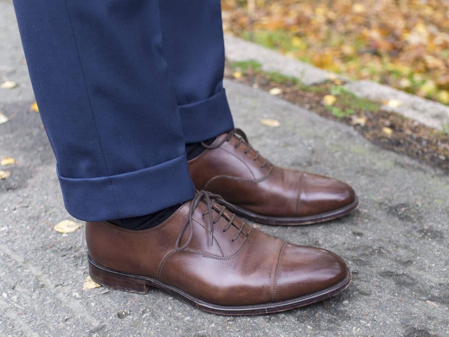 A nice pair of brown oxfords pair well with navy trousers, and especially enhanced by the turn-ups. Photo courtesy of The Nordic Fit.