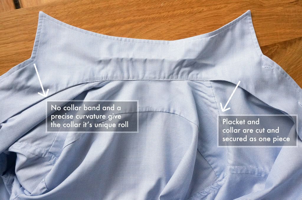 The collar itself is distinguished in that it’s cut from a single piece of cloth that extends through the front torso and doubles as a placket. This reinforcing effect allows the collar to stand on its own, without collapsing under it’s own weight. There is no interlining or collar band whatsoever which gives it a roll that you won’t see with any other shirt collar. We make ours with no top button and a curved top placket which give it a unique casual look.